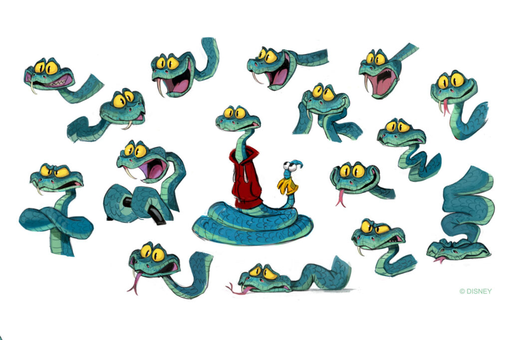 To create Gary the snake, animators looked at the style and movements of past Disney reptiles like the villainous Kaa from The Jungle Book, and Juju, Mana Odie’s seeing-eye snake in The Princess and the Frog.