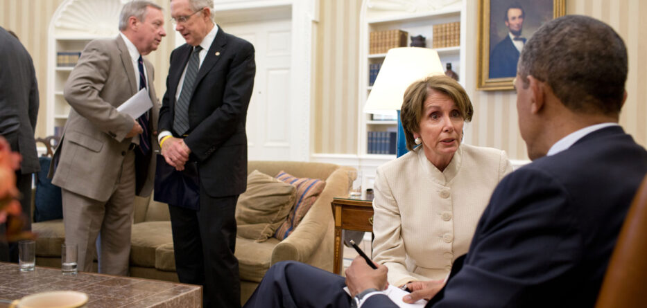 President Barack Obama talks with House Minority Leader Nancy Pelosi following a meeting with Democratic Leadership in the Oval Office, July 11, 2012. At left, Senate Majority Whip Dick Durbin talks with Senate Majority Leader Harry Reid. Photo Credit: Official White House Photo by Pete Souza / Public Domain