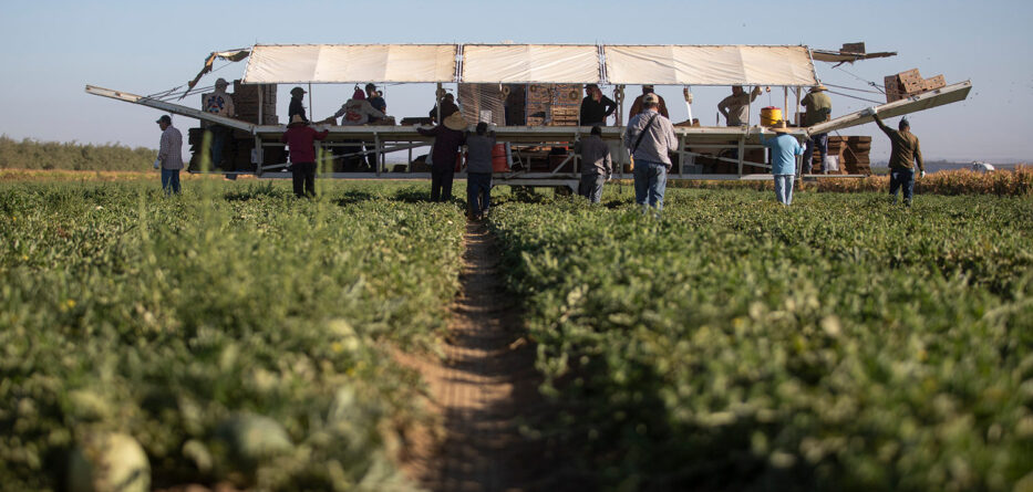 Melons in a field at a melon farm outside of Firebaugh. Photo Credit: Larry Valenzuela, CalMatters / CatchLight Local