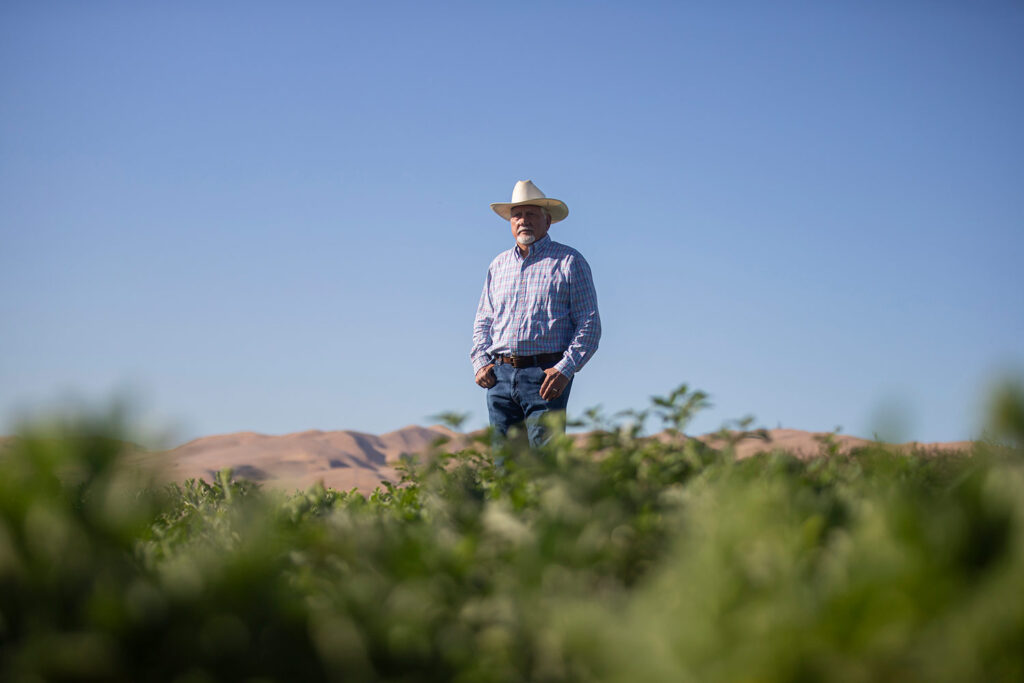 Joe Del Bosque, owner of Del Bosque Farms, stands in one of his melon fields as they are being harvested outside of Firebaugh on Sept. 11, 2025. Photo Credit: Larry Valenzuela, CalMatters / CatchLight Local