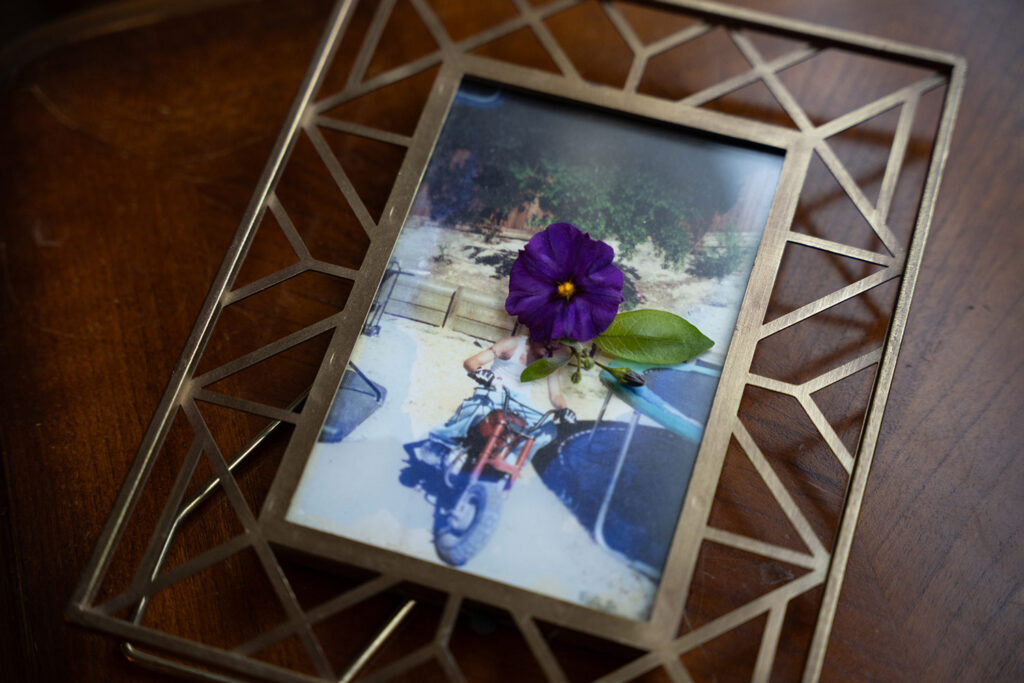 Una foto del hijo de Ronda Deplazes, que ahora tiene 38 años, montando en moto en el patio trasero de su casa cuando era niño, mucho antes de que le diagnosticaran su problema de salud mental. “Su pasión por la vida”, dijo ella, refiriéndose a las motos de motocross y a cómo su hijo ha sido un aventurero desde pequeño. Photo Credit: Florence Middleton for Catchlight / CalMatters
