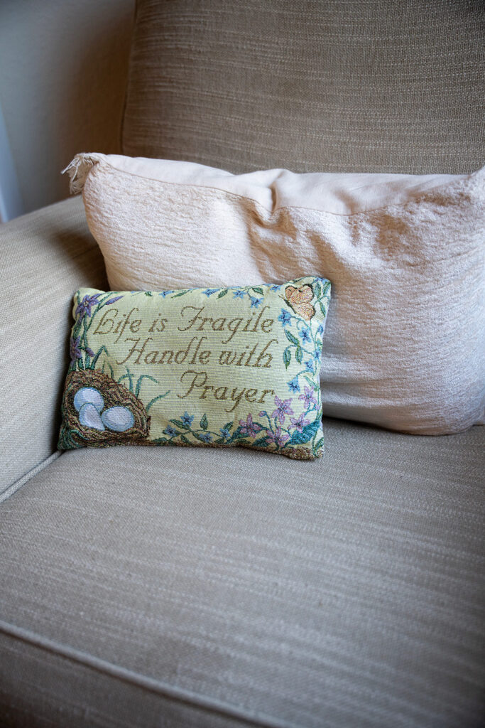 A pillow rests on an armchair at Ronda Deplazes’ home in Concord, on Oct. 27, 2025. Photo Credit: Florence Middleton for Catchlight / CalMatters
