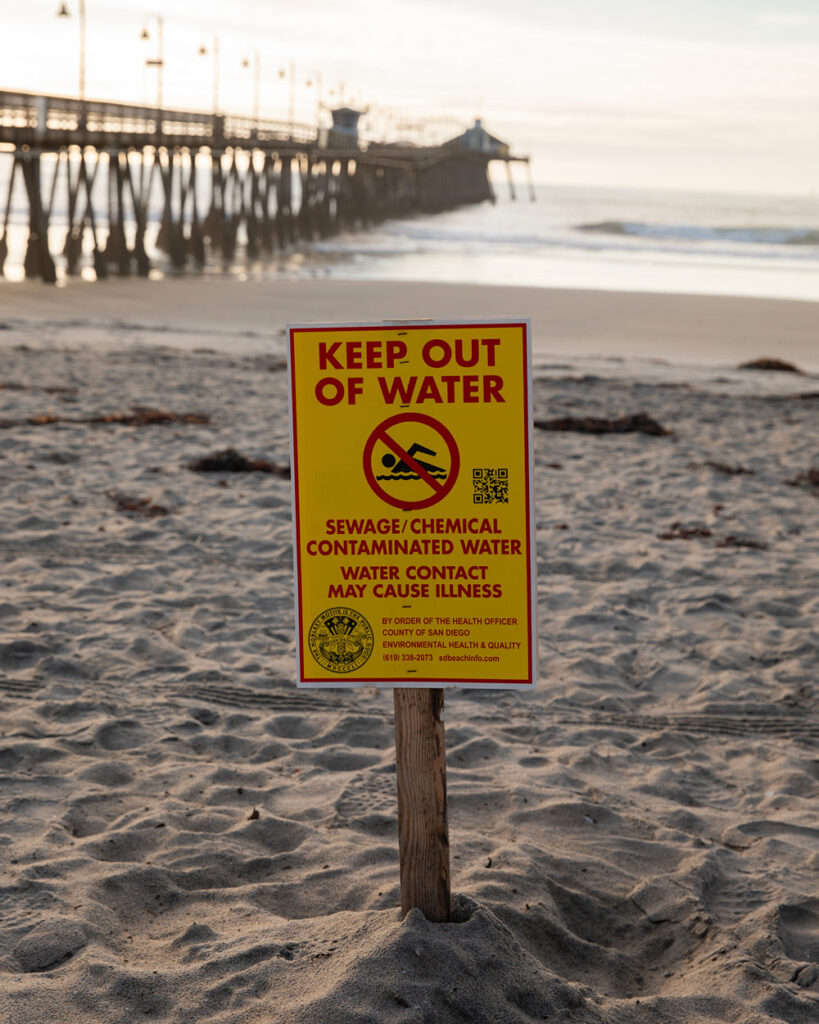 A warning sign about sewage and chemical contamination is posted along the shore of Imperial Beach on Nov. 21, 2025. Photo Credit: Adriana Heldiz / CalMatters