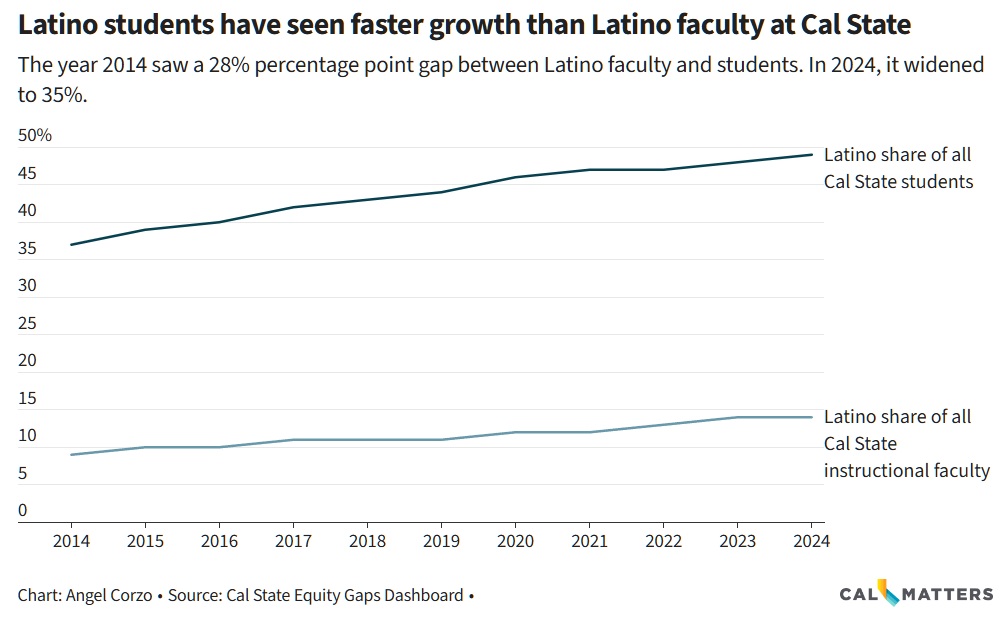 Even at Cal State Los Angeles, where in 2024 a massive 75% of its student population were Latino, only about a quarter of its faculty were, according to Cal State data compiled by CalMatters.