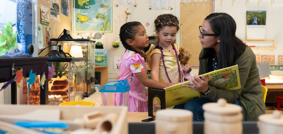 On a recent Friday morning, Jackson’s son, sporting a Spider-Man sweatshirt, picked flowers with a friend in one of Moore’s playgrounds. Their classmates whirled around them on tricycles, tinsel streaking their hair. After playtime, they gathered inside around teacher Kara Hannigan, who read from a picture book and prompted the children to act out each page with dramatic flair.