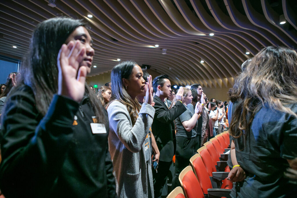 Los becarios toman juramento ante el gobernador Gavin Newsom durante una ceremonia en Sacramento el 7 de octubre de 2022. Photo Credit: Rahul Lal / CalMatters