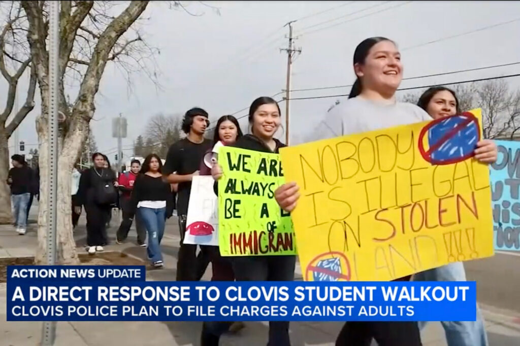 Students from the Clovis Unified School District walk out of class on Feb. 10, 2026, as part of a nationwide protest against federal immigration raids. Photo Credit: Screenshot via ABC30 Fresno